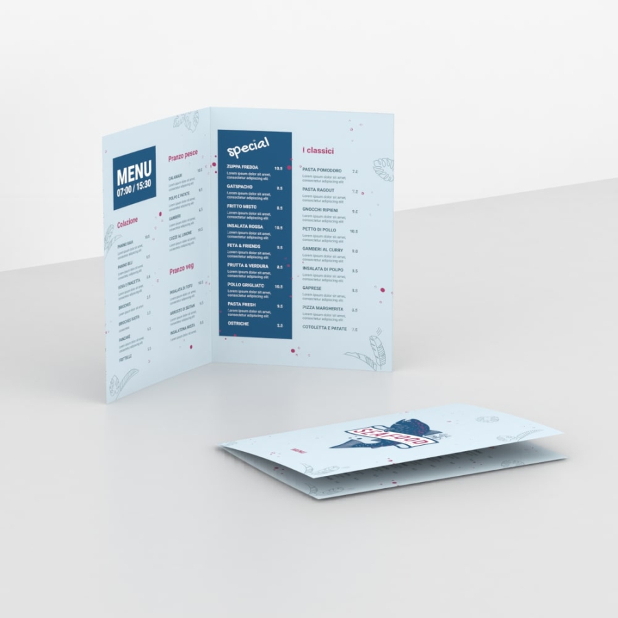 Componi il menù a 2 ante in base al tuo gusto e alle tue esigenze e presenta al meglio il tuo bar, il tuo ristorante, la tua trattoria, la tua pizzeria o i tuoi eventi culinari con il menù a 2 ante stampato da DoctaPrint solo per te!