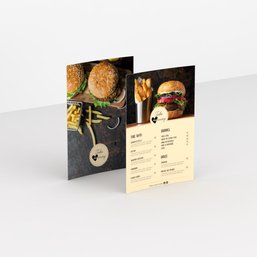 I menù senza piega sono i più economici e pratici: una sola pagina con 2 facciate a disposizione per convincere e attirare i tuoi clienti. Questo tipo di menù, prodotto con grammatura da300 gr, stampato su carta patinata opaca e plastificato è l’ideale per presentare un menù semplice e di facile consultazione.