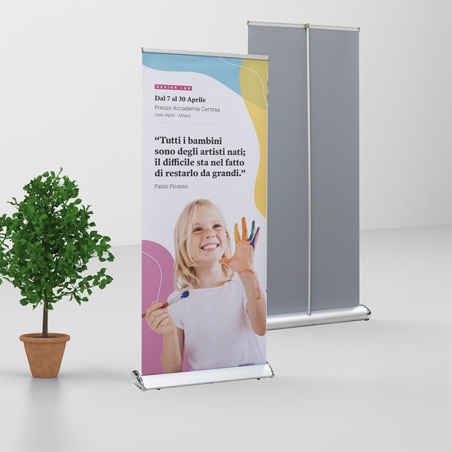 Puoi anche personalizzare e coordinare la stampa del tuo roll-up e di altri materiali di grande formato, per creare espositori aziendali coordinati e pronti per essere utilizzati in fiere, convegni o presentazioni. Sono disponibili anche opzioni per esterno, roll-up promozionali, formati speciali e modelli dedicati agli sponsor.